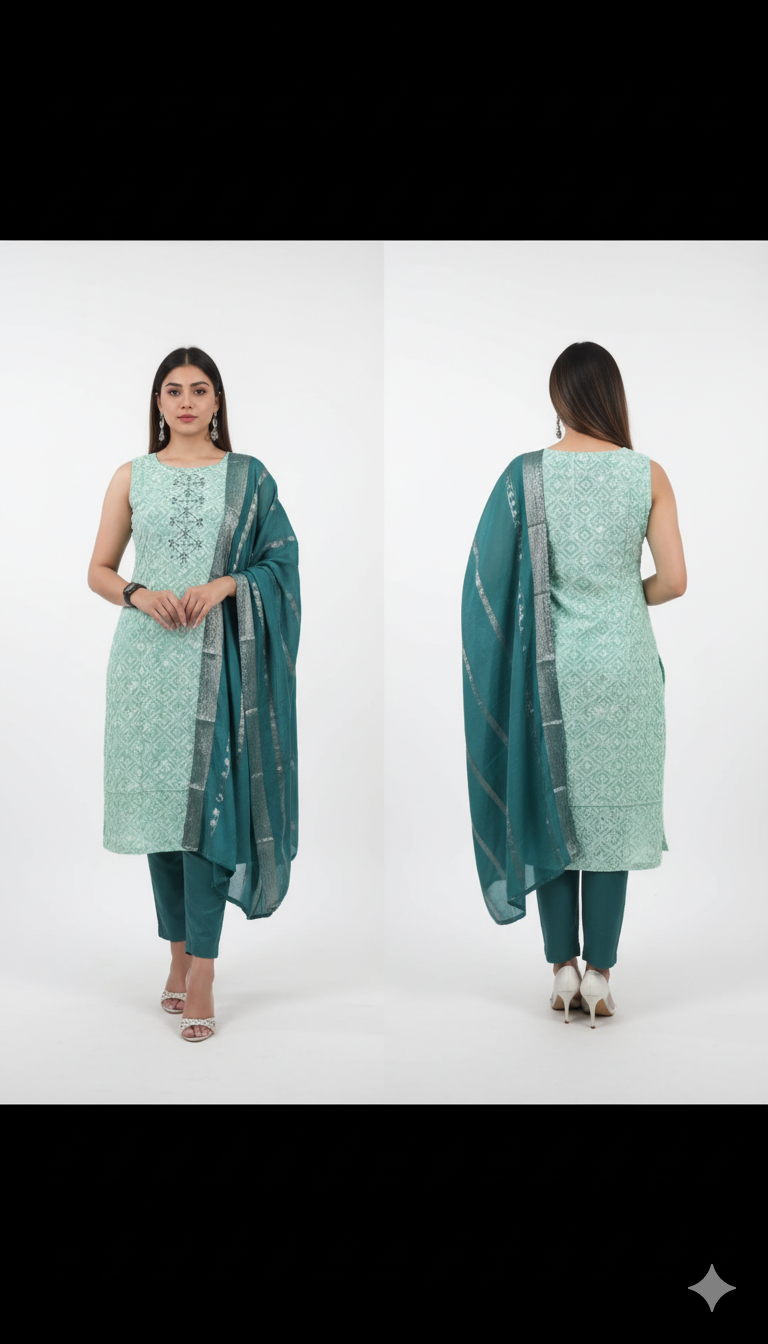 This complete ensemble includes a sleeveless regular kurta, matching trousers, and a coordinating dupatta. The floral prints add a touch of freshness and femininity, while the tailored design ensures comfort and elegance. Whether attending a casual gathering, a festive celebration, or a day out with friends, this set promises a stylish and polished appearance.